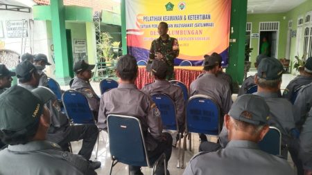 SIDOARJOterkini – Babinsa Koramil 0816/15 Sukodono Serda Andik Raharja berikan Pelatihan Keamanan dan Ketertiban Satuan Pelindung Masyarakat (Satlinmas) untuk meningkatkan kedisiplinan dan rasa tanggung jawab serta kekompakan saat melaksanakan tugas, di balai desa Plumbungan Kecamatan Sukodono, Sabtu pagi (30/12/2023).