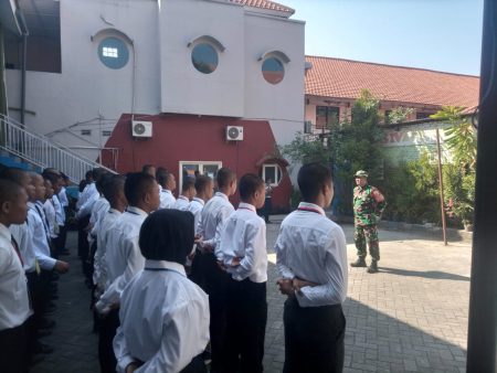 SIDOARJOterkini – Pelaksanaan Massa Perkenalan Lingkungan Sekolah (MPLS) peserta didik baru Tahun Pelajaran 2023/2024. Babinsa Koramil 0816/15 Sukodono Serma Abdul Rouf berikan pembekalan dan pelatihan Peraturan Baris Berbaris (PBB) bertempat di lapangan Sekolah SMK Pelayaran Yahari Sukodono, Sabtu 22 Juli 2023.