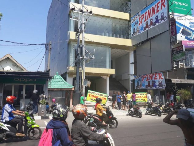 Menurut pantauan dilokasi, dua spanduk bertuliskan “Bangunan ini tidak ijin warga” dibentangkan oleh warga di depan ruko lima lantai tersebut. Hal itu dilakukan, karena warga geram dengan pihak toko elektronik JH Phone yang mengabaikan keselamatan warga sekitar.