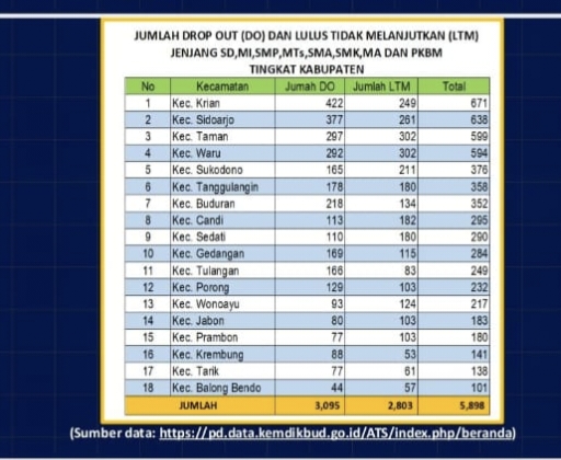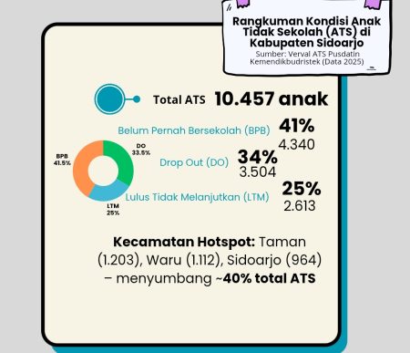 Data dari Verval ATS Pusdatin Kemendikbudristek 2025 menunjukkan terdapat 10.457 anak di Sidoarjo yang berstatus tidak sekolah. Dari jumlah tersebut, 41% belum pernah mengenyam pendidikan, 34% putus sekolah di tengah jalan, dan 25% berhenti setelah lulus tanpa melanjutkan ke jenjang berikutnya.