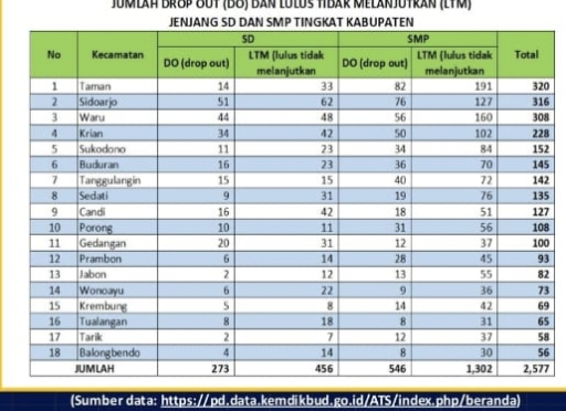 Tiga kecamatan dengan jumlah ATS tertinggi yakni Taman (1.203 anak), Waru (1.112 anak), dan Sidoarjo (964 anak) — menyumbang hampir 40 persen dari total ATS di seluruh kabupaten. Sebagian besar berasal dari keluarga berpenghasilan rendah atau bekerja membantu orang tua di sektor informal.
