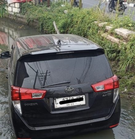 SIDOARJOterkini – Sebuah mobil Toyota Kijang Innova warna hitam dengan nomor polisi L 1348 DI mengalami kecelakaan tunggal dan tercebur ke sungai di Jalan Raya Panjunan, tepat di depan Masjid Al Ishlah, Kecamatan Sukodono, Minggu (26/10/2025).