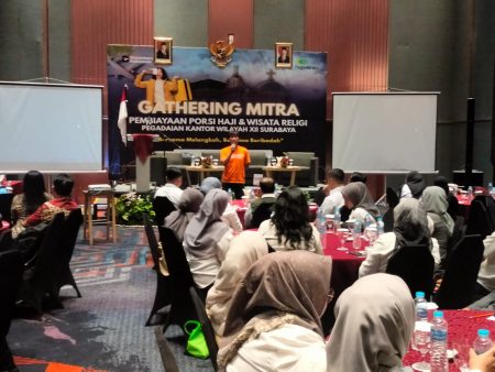 SIDOARJOterkini l Surabaya — PT Pegadaian Kanwil XII Surabaya menggelar Gathering Mitra Pembiayaan Porsi Haji dan Wisata Religi di Hotel Harris Gubeng, Rabu (3/12/2025). Acara ini menghadirkan 15 mitra travel religi dan sembilan perwakilan majelis gereja, serta jajaran pimpinan Pegadaian Area Surabaya 1 dan Surabaya 2.