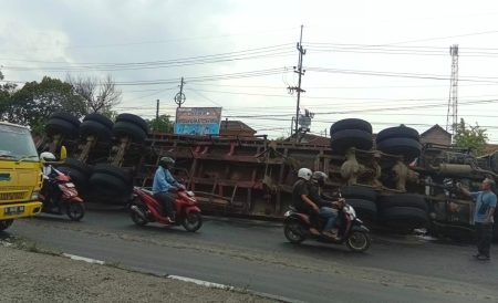 Pemotor Tewas Tertimpa Trailer Kontainer Terguling di TL Jabaran Balongbendo
