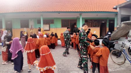 Dalam suasana penuh keceriaan, Sertu Mar Endi Prawira, anggota Satgas TMMD ke-126 Kodim 0816/Sidoarjo, memberikan pembelajaran dasar tentang disiplin dan nasionalisme kepada anak-anak.